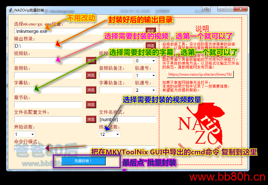 1.用软件把需要封装的字幕和视频的文件名改成一致的序列,比如:01.MP4和01.ass、02.MP4和02.ass、
